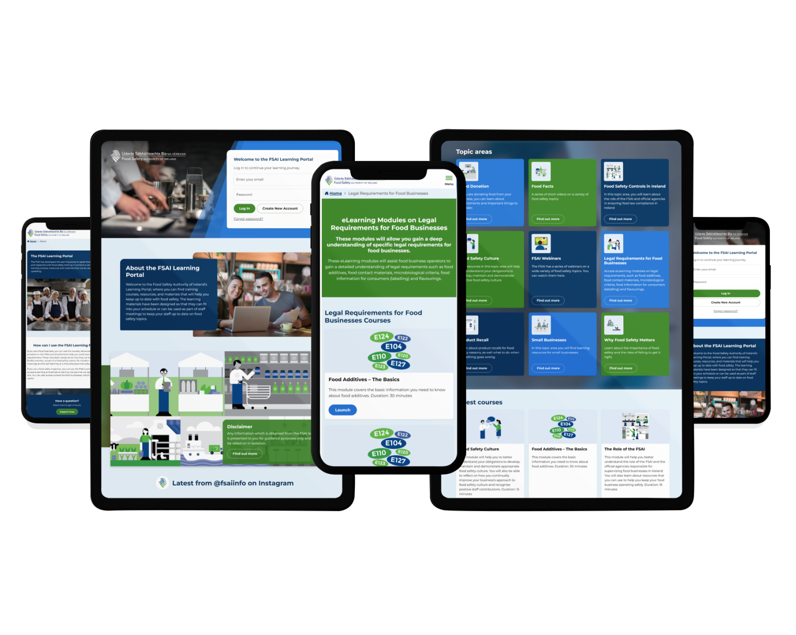 Working closely with the FSAI project delivery team and key project stakeholders, we helped FSAI develop a bespoke online learning portal, seamlessly integrating this with their upgraded learning management system (LMS). This custom-built solution provides an intuitive, device-neutral experience with user-friendly front-end navigation.